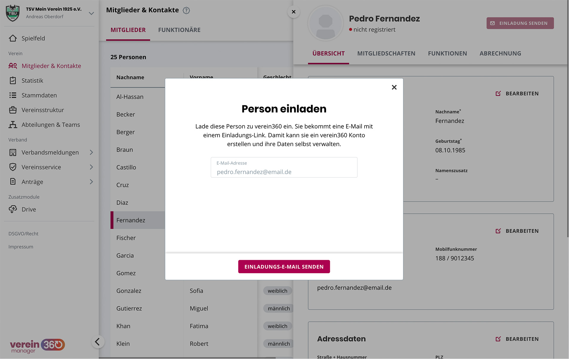 Öffne die Mitgliederakte, bearbeite Übersicht, Mitgliedschaften, Funktionen und Abrechnung – und speichere Änderungen gezielt.