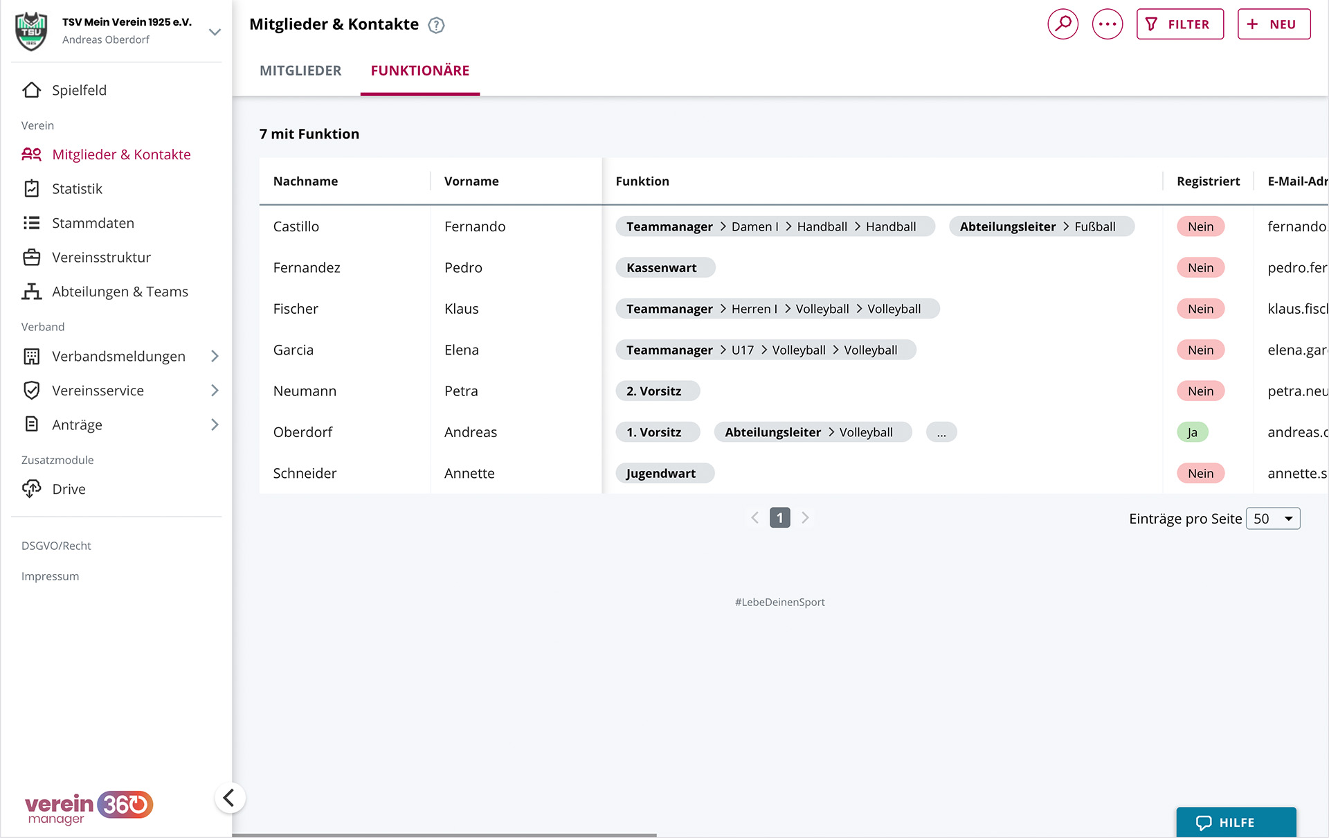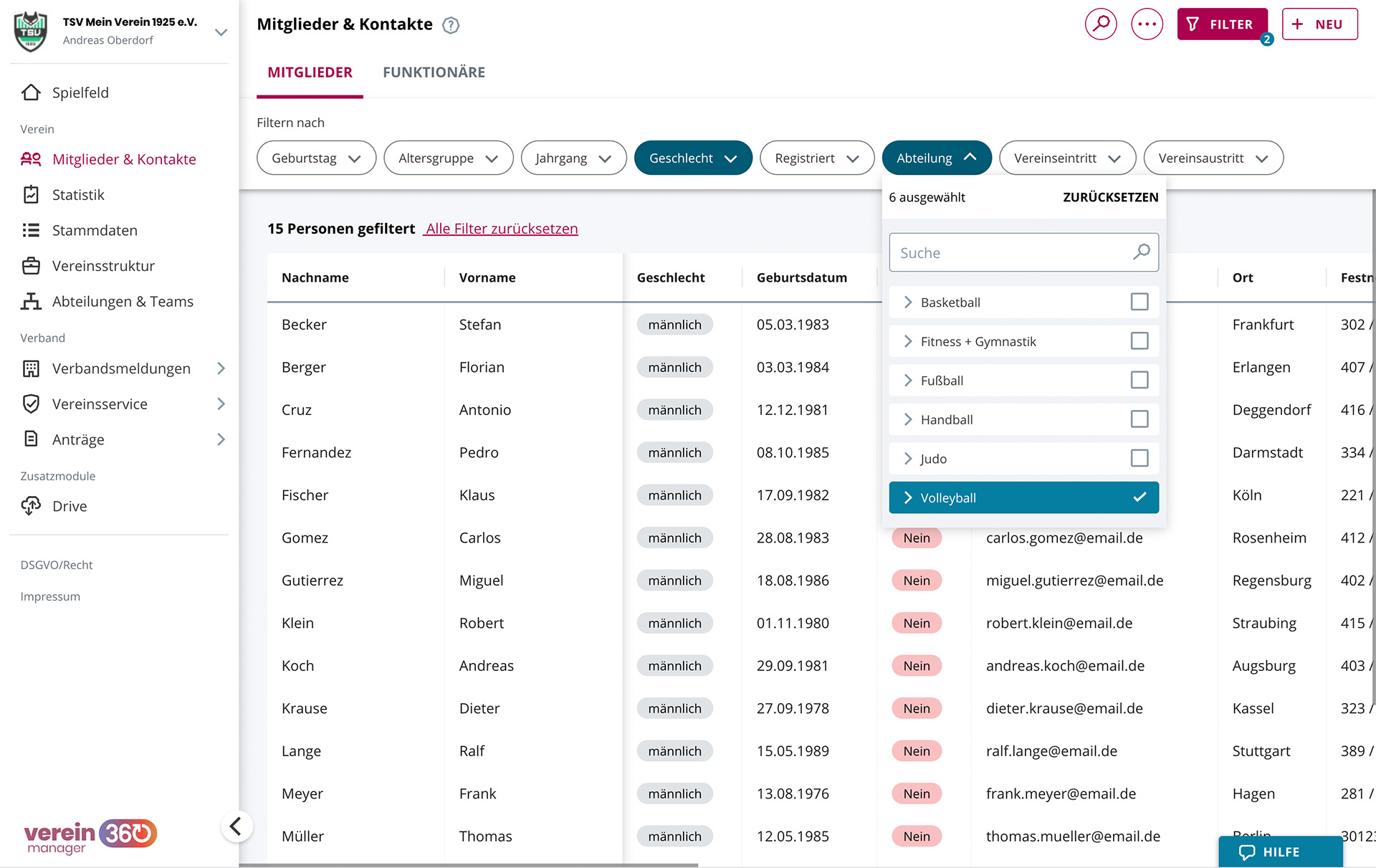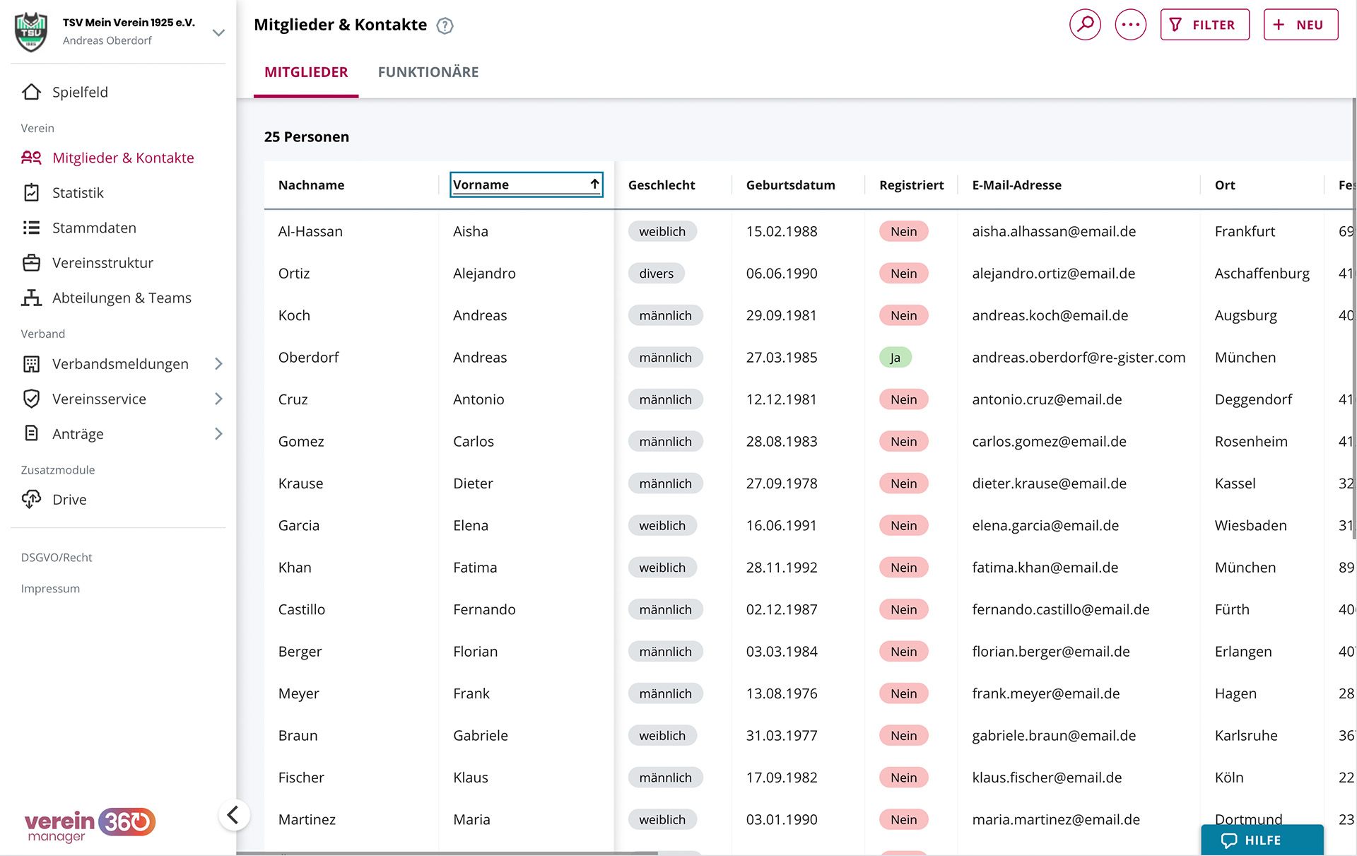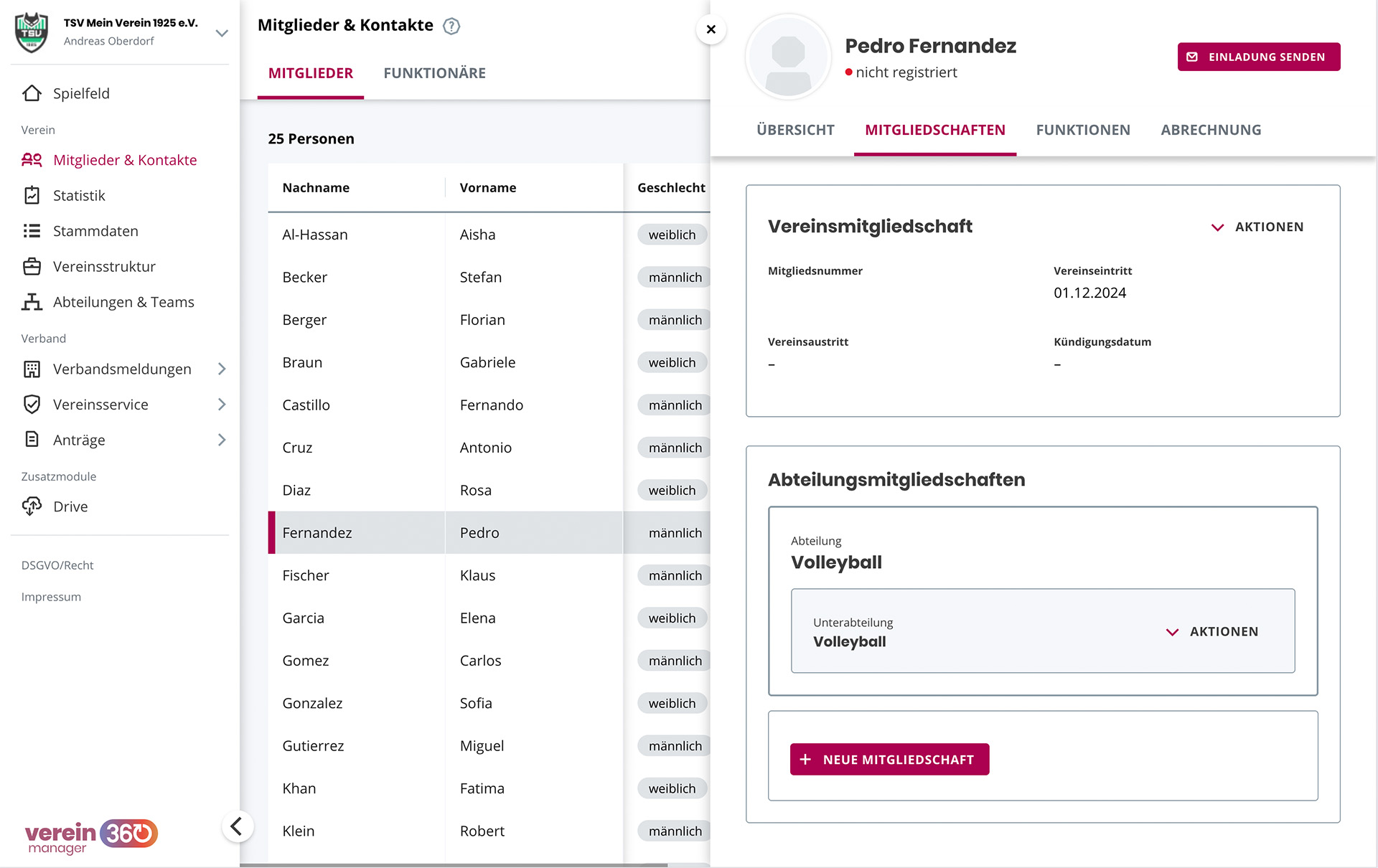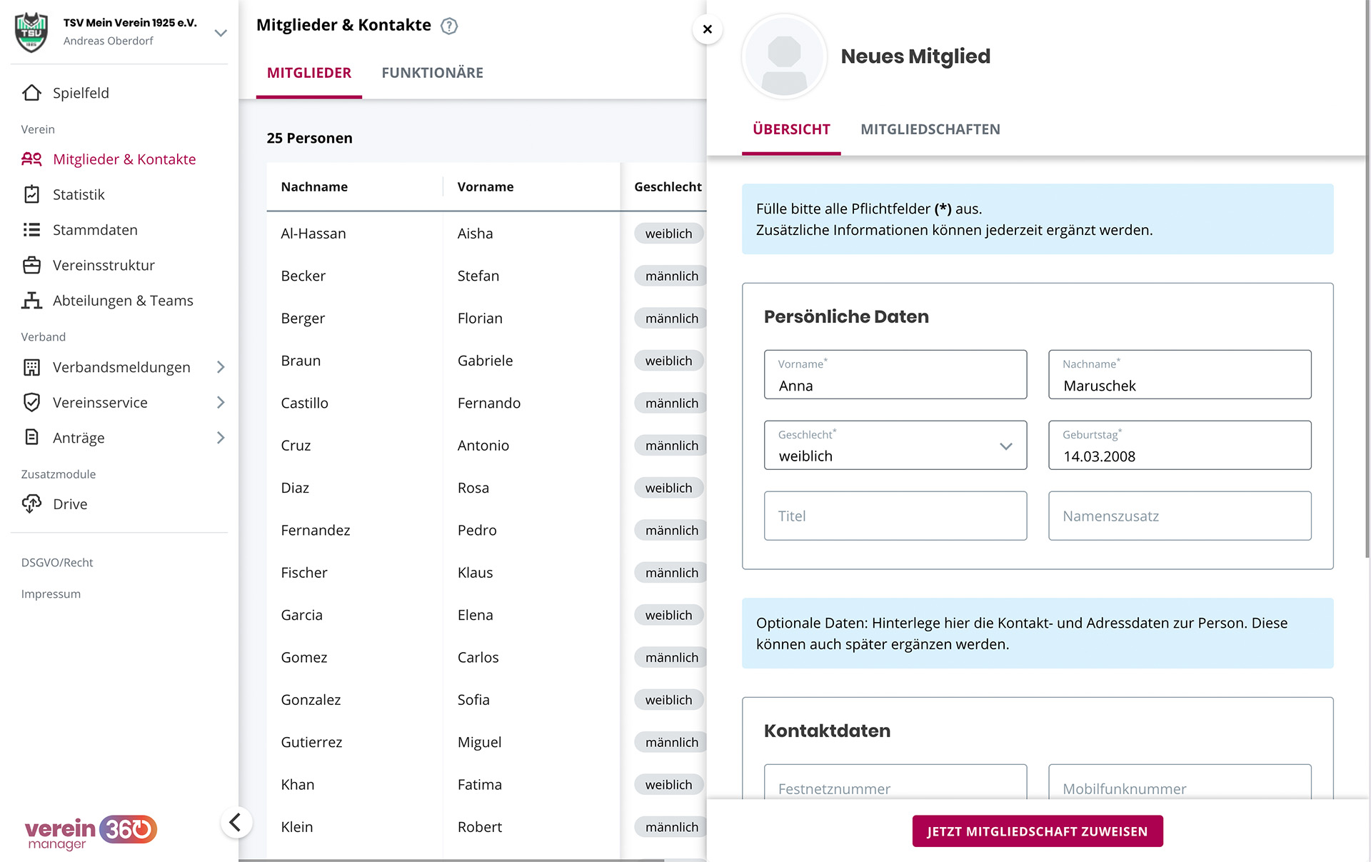Klicke auf + NEU, erfasse die Basisdaten und weise direkt die passende Mitgliedschaft zu – inklusive Abteilung und Unterabteilung.