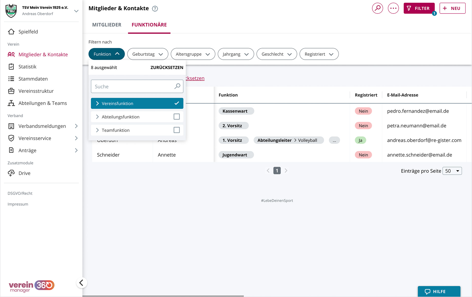 Öffne die Filter, wähle Kategorien wie Funktion, Alter oder Registrierung und setze Haken bzw. Eingaben – inklusive schneller Rücksetzung.
