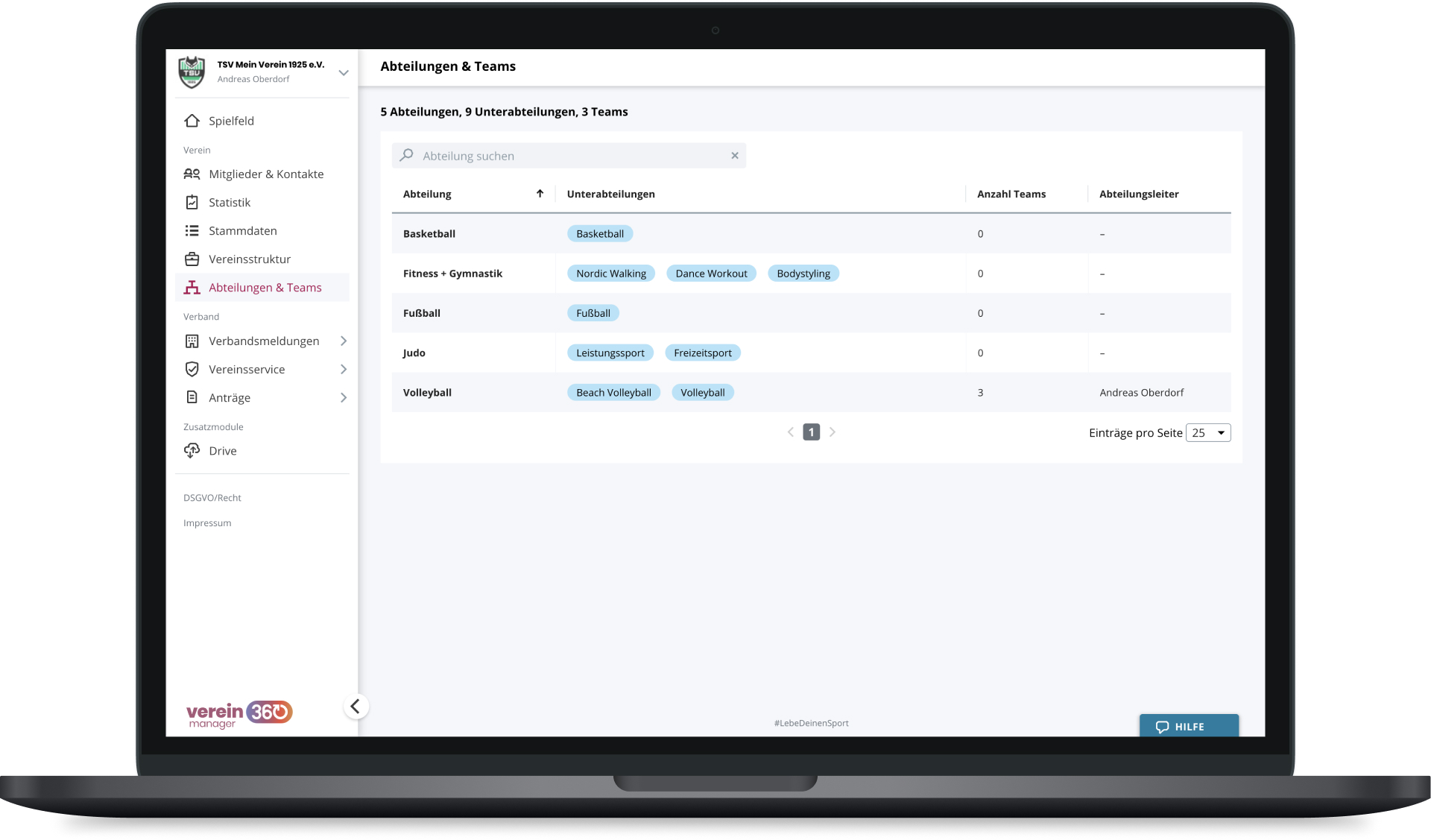 In verein360 manager hast du im Bereich Abteilungen & Teams die Möglichkeit, die Abteilungen deines Vereins einzusehen, die Funktionäre der Abteilungen zu bearbeiten und die Teams und Mitglieder der einzelnen Abteilungen zu pflegen. Du lernst, wie du dich durch die Abteilungsstrukturen navigierst, Abteilungen und Teams sowie Verantwortlichkeiten und Mitglieder bearbeitest.