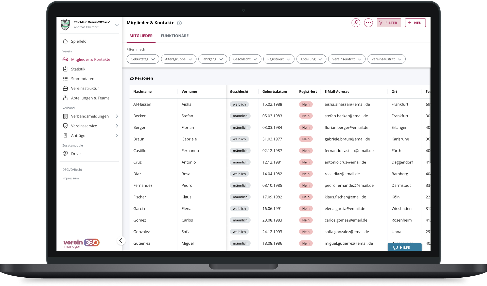 In verein360 manager hast du im Bereich Mitglieder & Kontakte den Überblick über all deine Vereinsmitglieder und Funktionäre. Du lernst, welche Möglichkeiten dir die Mitglieder- und Funktionärsliste bietet und wie du Daten im- und exportieren kannst.