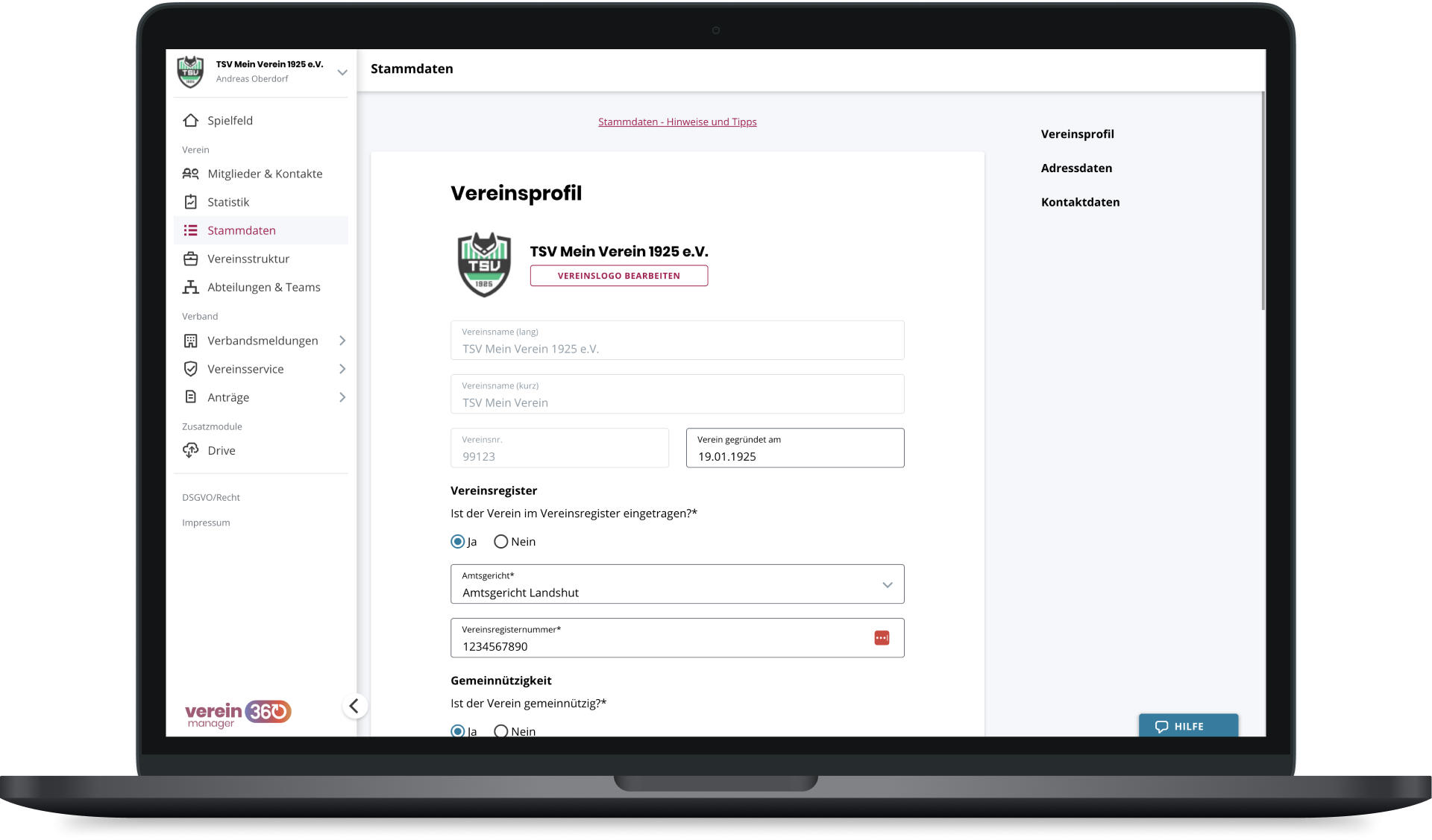 In verein360 manager kannst du die Stammdaten deines Vereins stets aktuell hinterlegen.