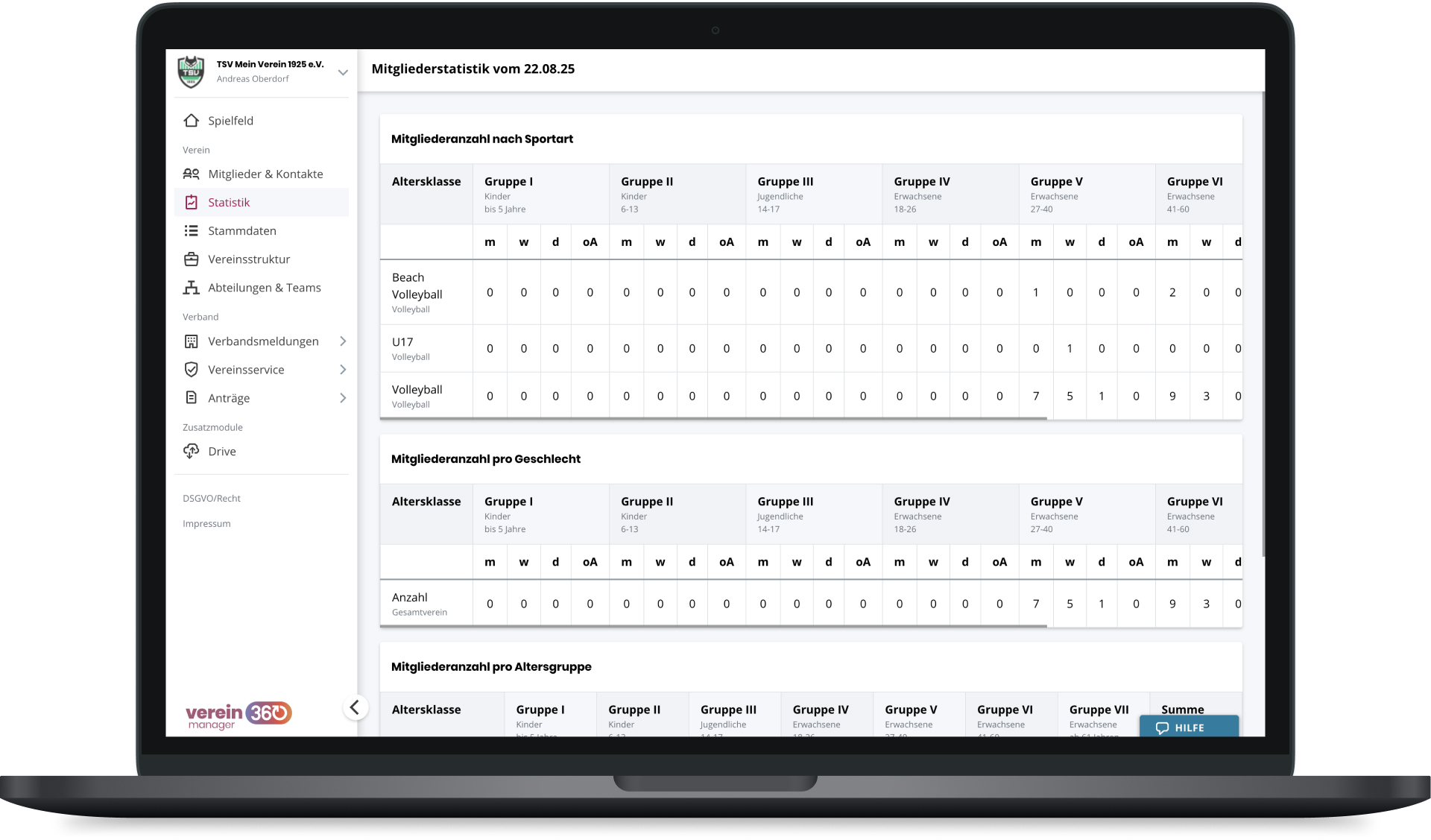 In verein360 manager findest du im Bereich Statistik verschiedene, automatisch erstellte Berichte zur Mitgliederverteilung in deinem Verein, die sich jeweils auf die Daten des aktuellen Tages beziehen.